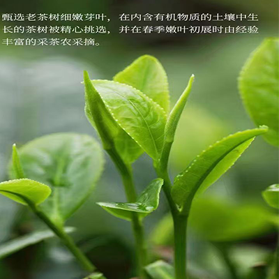 甄选老茶树细嫩芽叶,在内含有机物质的土壤中生长的茶树被精心挑选,并在春季嫩叶初展时由经验丰富的采茶农采摘。