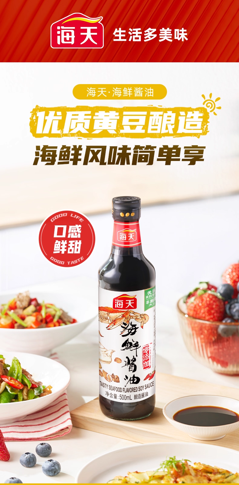 海天海鲜酱油500ml添加干贝黄豆酿造生抽家用鲜味蒸鱼豉油调味