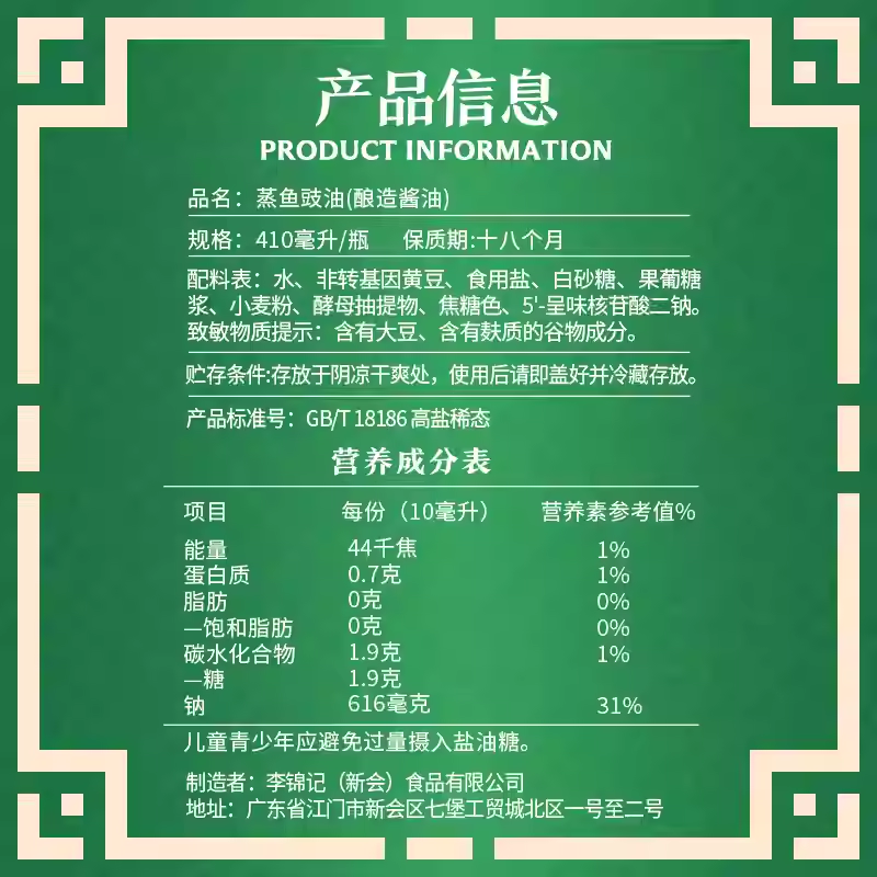 李锦记蒸鱼豉油410ml去腥清蒸海鲜白灼调味酿造酱油生抽家用