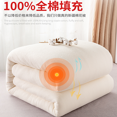 原料:采用新疆南疆手采棉的棉花作为原料,整张被子全部都是棉花填充,不会为了降低成本拉低品质在被子里填充黑心棉,垃圾棉,和差棉,所有的产品品质可全部包质检 做工:采用加密的鱼鳞网纱,含棉量高,比普通化纤的纱网更舒适,做出来的棉被不容易起球掉絮,棉被四周有精美的布条包边,使被子更加的结实耐用