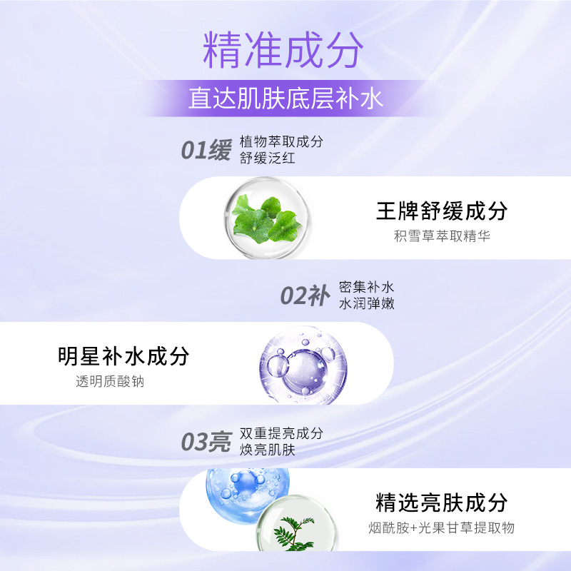 本品添加多种植物精粹,搭配甘油、透明质酸钠、透明质酸等保湿补水成分,补水保湿,扑充肌肤水分,令肌肤嫩滑细腻,水感嫩弹。