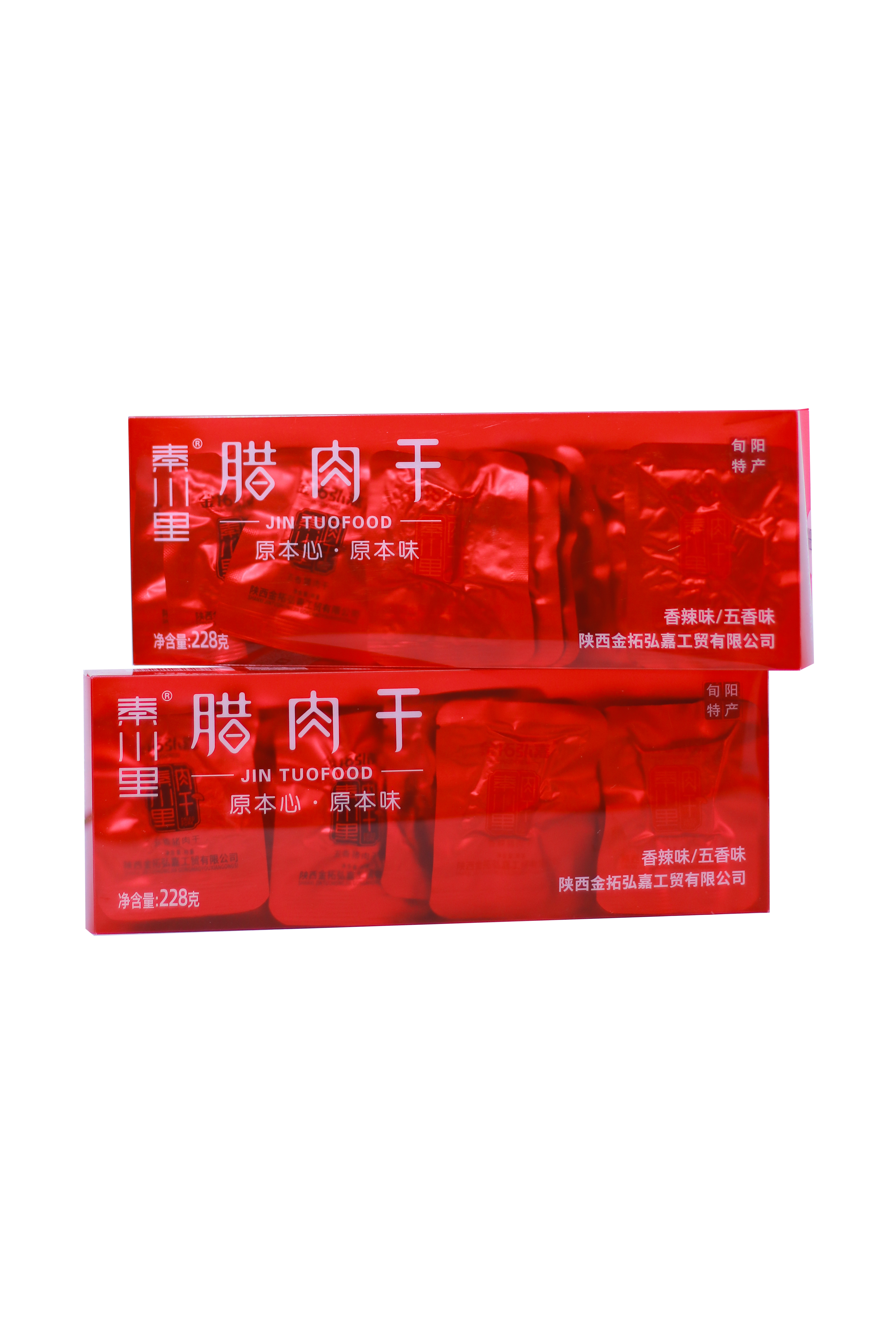 “秦川里”品牌腊肉干 所用原材料均取材于秦巴山区原生态放养猪,生长周期都在一年以上。制作工艺采用传统的腌制方法,腌制时间根据季节、肉的种类和部位来确定,通常控制在3--7天。经过多年摸索,结合农家烟熏的经验,选用桦梨木作为燃料。保证了腊肉的色泽、香气和口感,保留了秦巴腊肉的传统风味。 产品在生产过程种均不允许添加食品行业禁止、限制的添加剂、色素、防腐剂等物质,对于日常使用的酱油、食盐等调味品,严格按照要求使用,确保大家可以吃到记忆里儿时的味道。