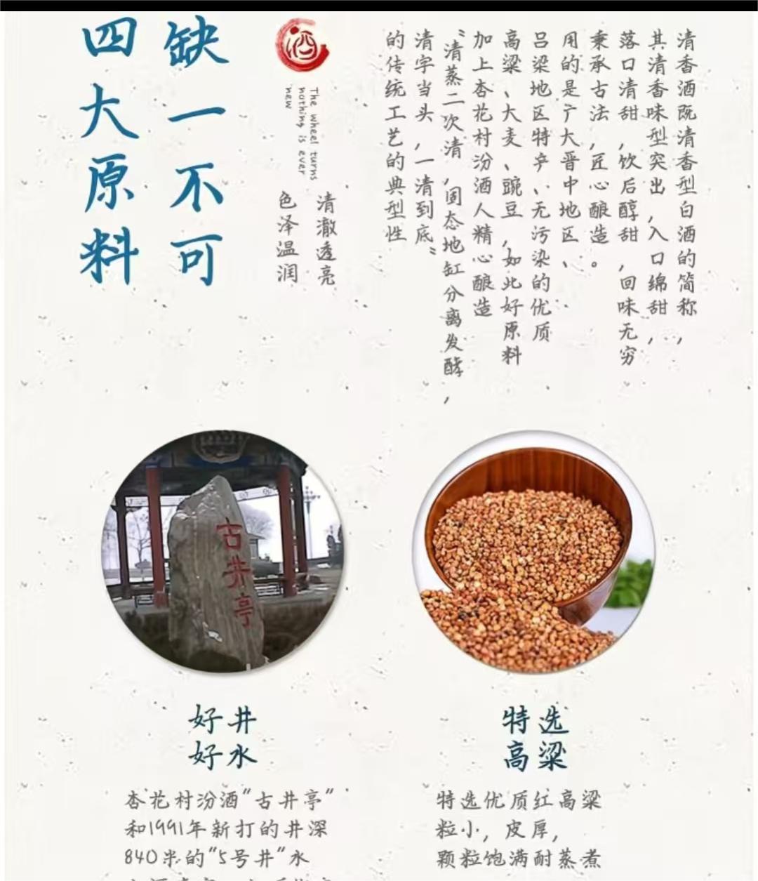 纯粮白酒,清香典范,酒花细腻,挂杯持久。