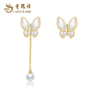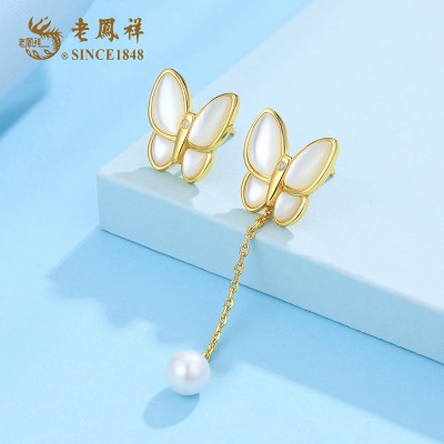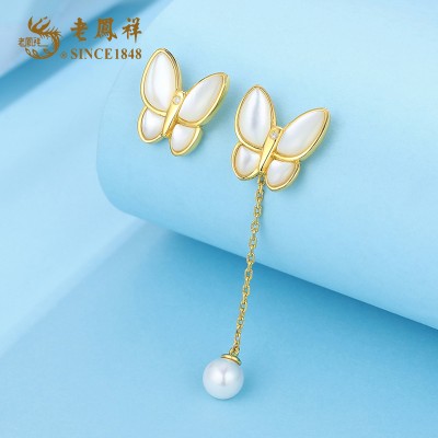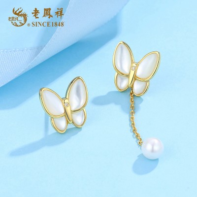 老凤祥天然钻石蝴蝶翩翩S925银贝母不对称流速耳坠 LFX000119
