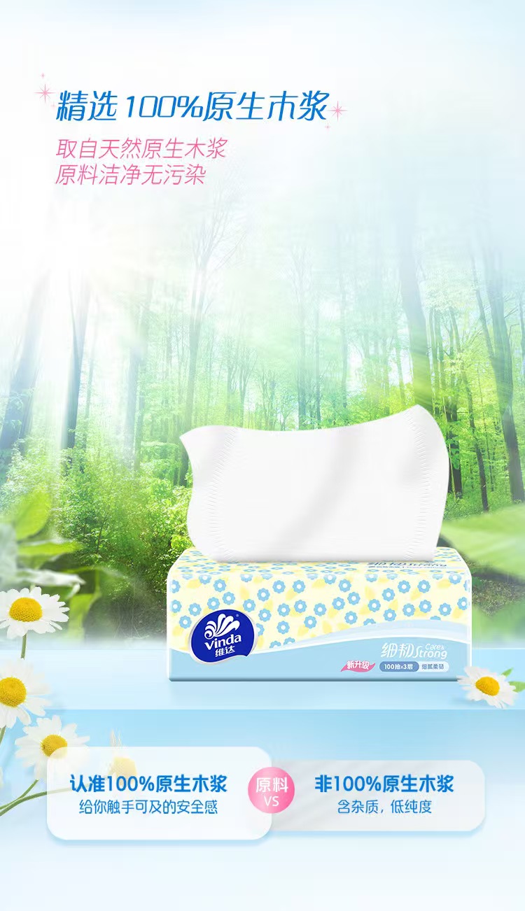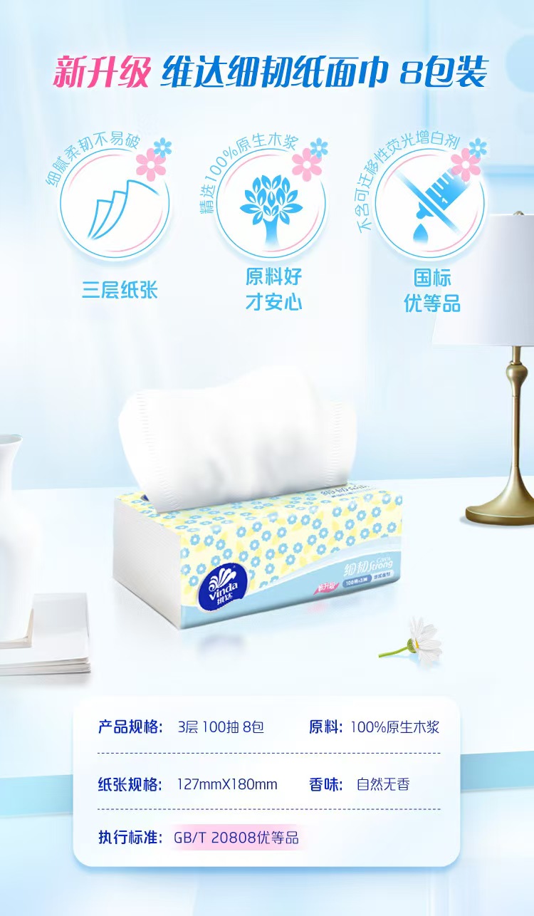 维达细韧抽纸8包 3层100抽 规格127*180